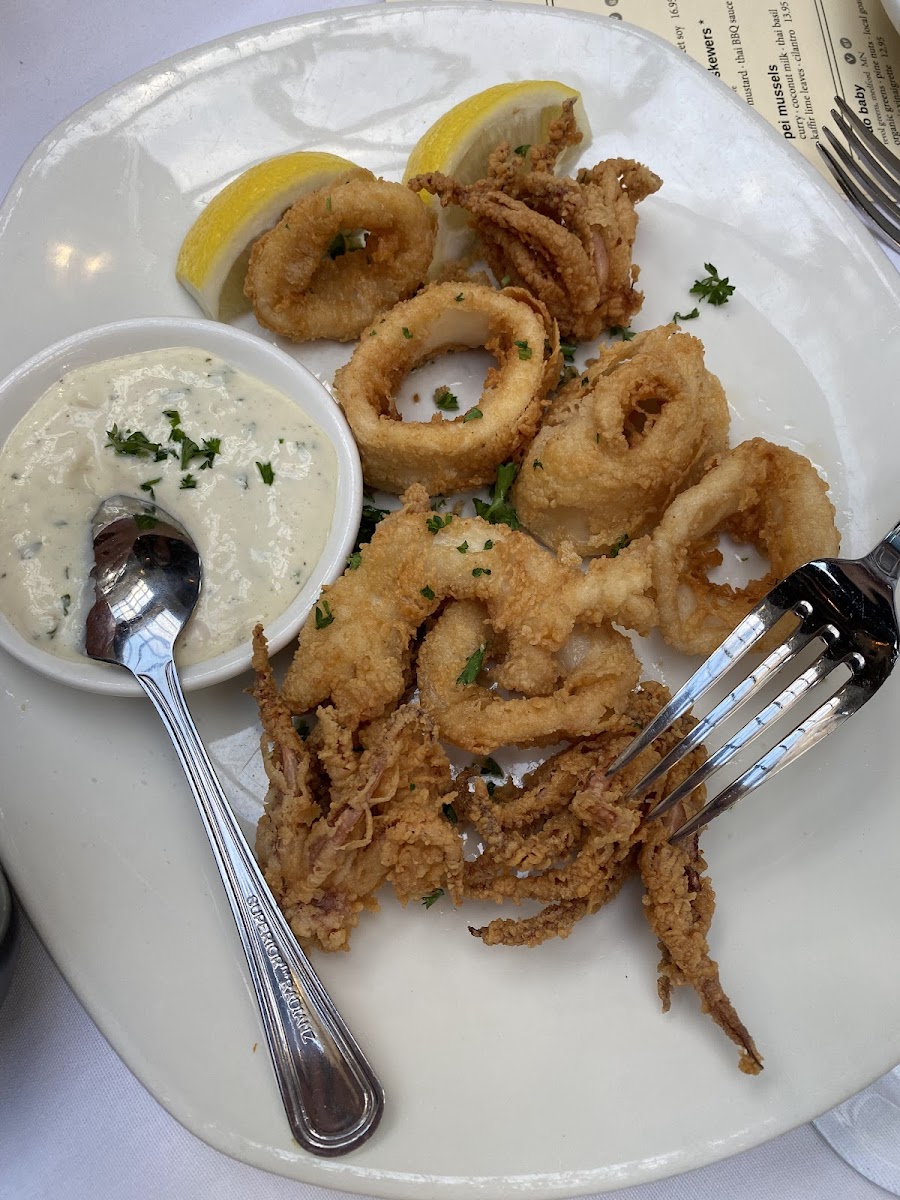 Very soft and well seasoned complimentary bread, light whipped butter. Well seasoned and crispy calamari , with a zesty dip. The chicken parmesan tasted a bit bitter and bland, looks kind of burnt. The marinara tasted good though. The fettuccine alfredo is quite bland as well. The quantity is shockingly small for the price. The fries are crispy and well seasoned but unevenly seasoned. The burger is quite tall but still well seasoned/sauced. Was not asked about how it should be cooked so the burger came out medium with plenty of pink center.